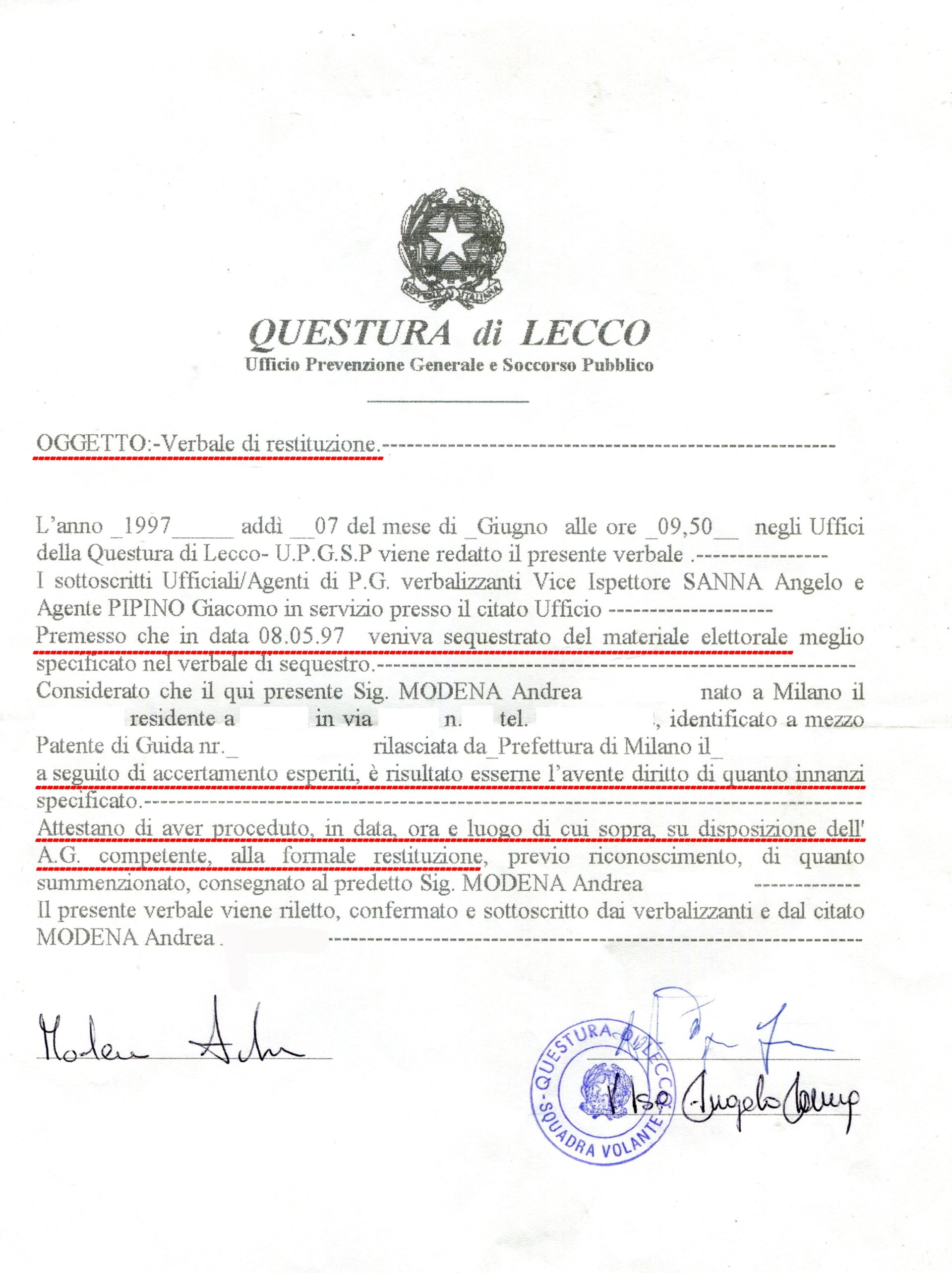 (Digos), eravamo una minaccia, come i catalani in spagna oggi ai quali auguro ogni bene e indipendenza, malgrado questa €uropa, sempre più lontano dalla gente. In ogni modo, qui sotto riporto i documenti che ufficializano i fatti, tanto che il materiale "sequestrato", è stato restituito e utilizzato !