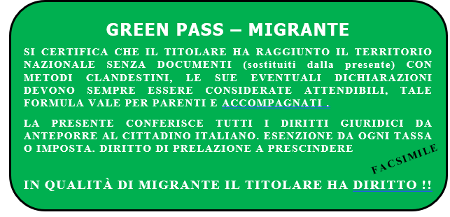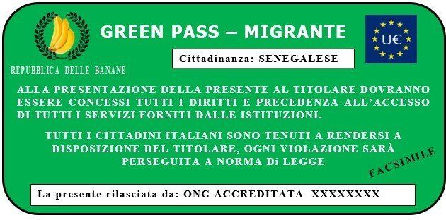 Notizia dell’ultima ora, il governo nazional-italiota, ha formulato un nuovo documento “Green pass” (o green card), il quale deve essere rilasciato tramite la collaborazione delle principali ONG accreditate, allo sbarco per tutti i migranti.